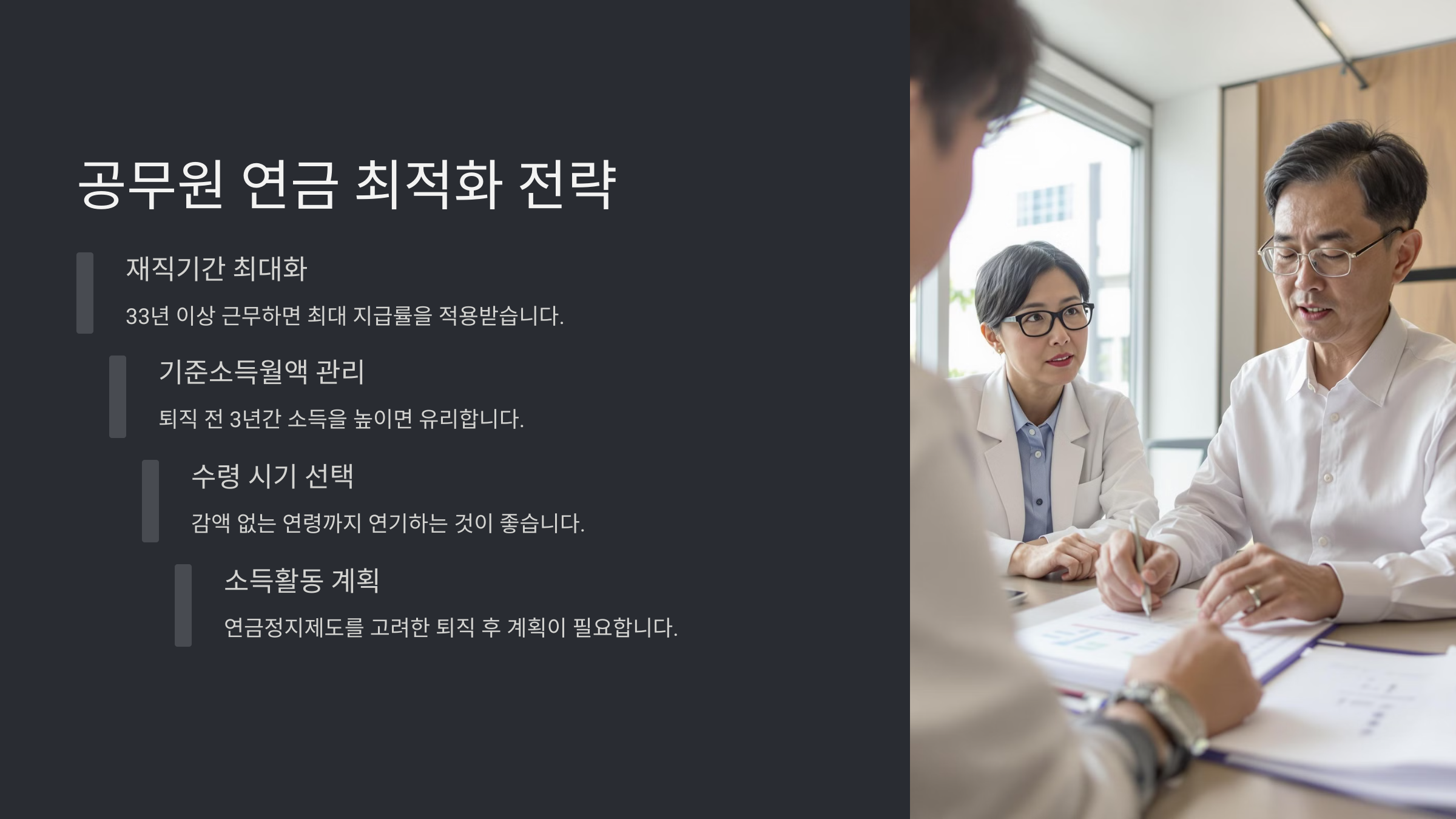 연금 수령액은 재직 기간에 비례해 증가해요. 최소 10년을 채워야 연금을 받을 수 있으며, 30년 이상 근속하면 최대 혜택을 받을 수 있어요. 재직 기간을 늘리는 것이 가장 확실한 연금 최적화 방법이에요.